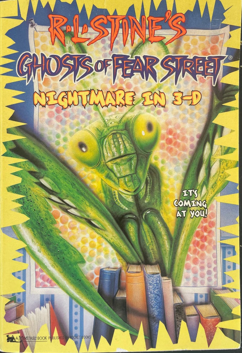 I give Nightmare in 3-D (don’t forget the dash) a passing grade, but with 6 billion kids’ horror novellas out there, the only real reason to read this one is if you think praying mantises are particularly awesome.